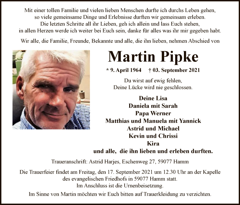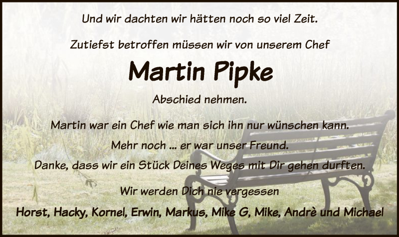 Hier finden Sie alle Traueranzeigen aus der Zeitung, die bisher für Martin Pipke erschienen sind. Weitere Traueranzeigen, die in der Zeitung erscheinen, werden hier ebenfalls aufgelistet
