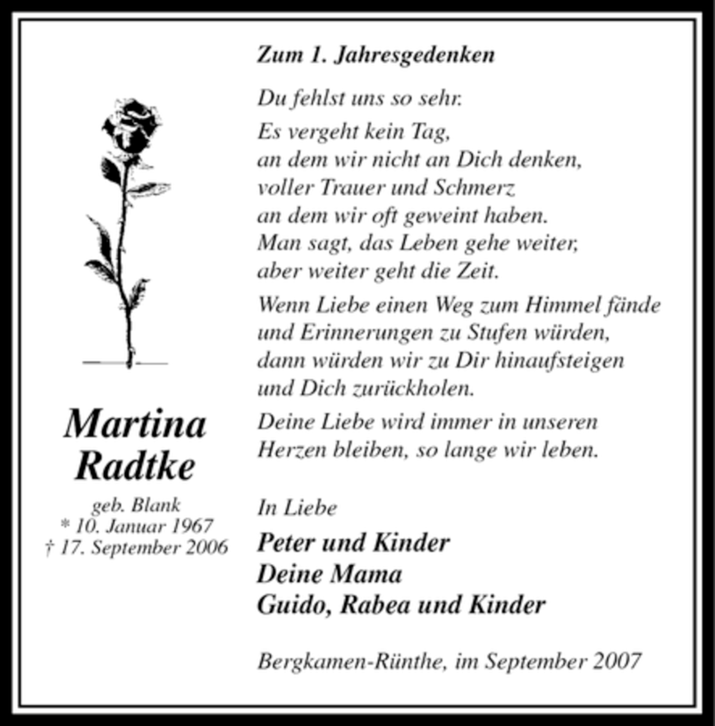 Hier finden Sie alle Traueranzeigen aus der Zeitung, die bisher für Martina Radtke erschienen sind. Weitere Traueranzeigen, die in der Zeitung erscheinen, werden hier ebenfalls aufgelistet