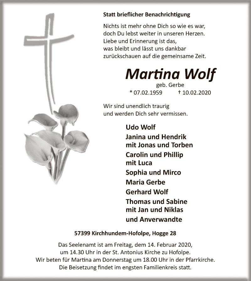 Hier finden Sie alle Traueranzeigen aus der Zeitung, die bisher für Martina Wolf erschienen sind. Weitere Traueranzeigen, die in der Zeitung erscheinen, werden hier ebenfalls aufgelistet