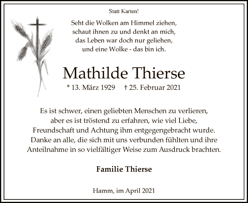 Hier finden Sie alle Traueranzeigen aus der Zeitung, die bisher für Mathilde Thierse erschienen sind. Weitere Traueranzeigen, die in der Zeitung erscheinen, werden hier ebenfalls aufgelistet