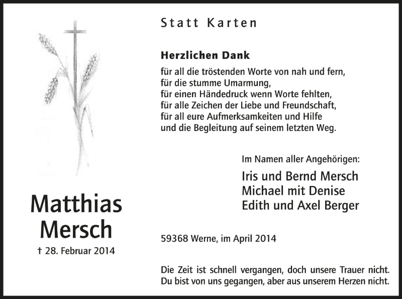 Hier finden Sie alle Traueranzeigen aus der Zeitung, die bisher für Matthias Mersch erschienen sind. Weitere Traueranzeigen, die in der Zeitung erscheinen, werden hier ebenfalls aufgelistet