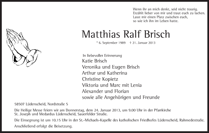 Hier finden Sie alle Traueranzeigen aus der Zeitung, die bisher für Matthias Ralf Brisch erschienen sind. Weitere Traueranzeigen, die in der Zeitung erscheinen, werden hier ebenfalls aufgelistet