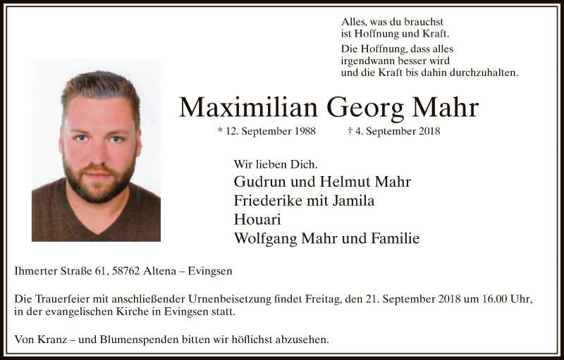 Hier finden Sie alle Traueranzeigen aus der Zeitung, die bisher für Maximilian Georg Mahr erschienen sind. Weitere Traueranzeigen, die in der Zeitung erscheinen, werden hier ebenfalls aufgelistet