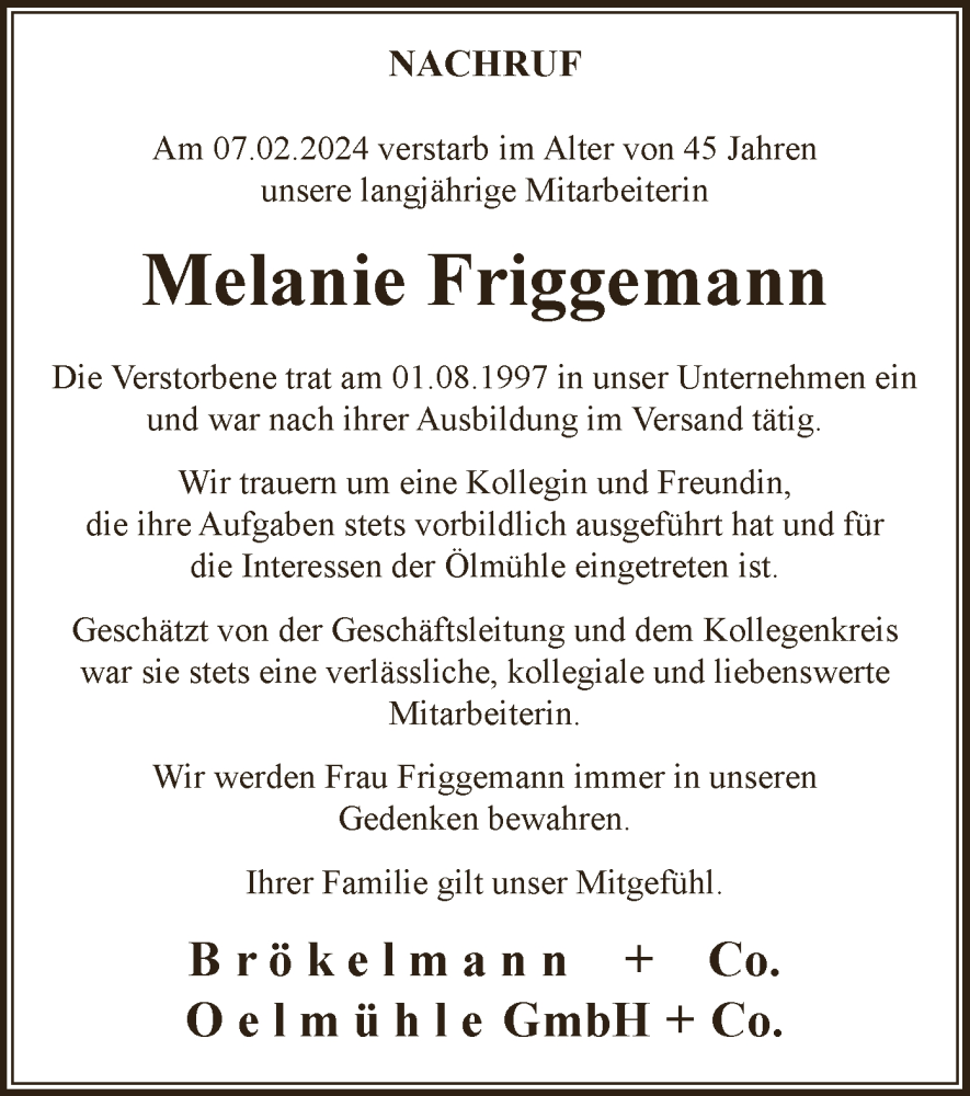 Hier finden Sie alle Traueranzeigen aus der Zeitung, die bisher für Melanie Friggemann erschienen sind. Weitere Traueranzeigen, die in der Zeitung erscheinen, werden hier ebenfalls aufgelistet
