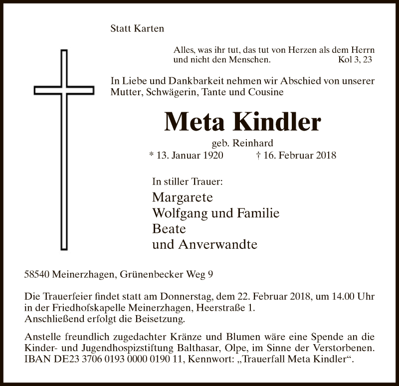 Hier finden Sie alle Traueranzeigen aus der Zeitung, die bisher für Meta Kindler erschienen sind. Weitere Traueranzeigen, die in der Zeitung erscheinen, werden hier ebenfalls aufgelistet