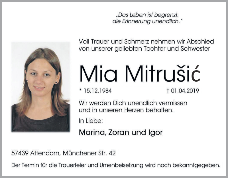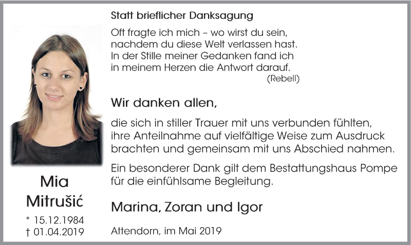 Hier finden Sie alle Traueranzeigen aus der Zeitung, die bisher für Mia Mitrusic erschienen sind. Weitere Traueranzeigen, die in der Zeitung erscheinen, werden hier ebenfalls aufgelistet