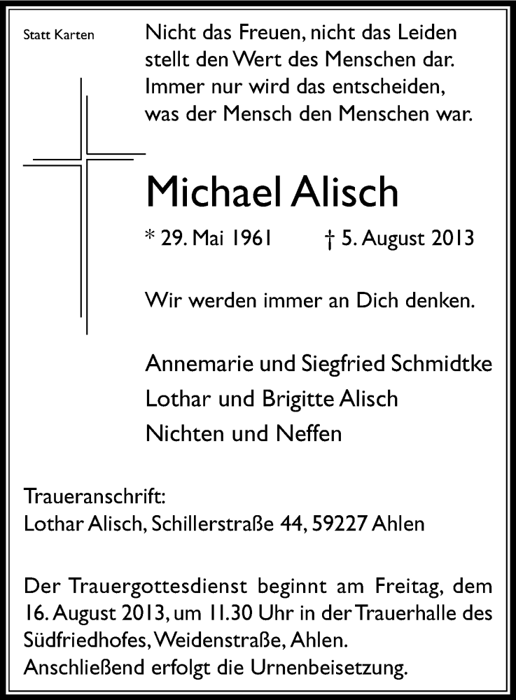 Hier finden Sie alle Traueranzeigen aus der Zeitung, die bisher für Michael Alisch erschienen sind. Weitere Traueranzeigen, die in der Zeitung erscheinen, werden hier ebenfalls aufgelistet