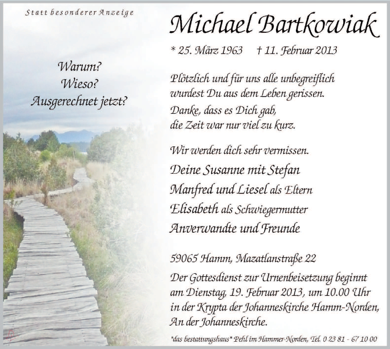 Hier finden Sie alle Traueranzeigen aus der Zeitung, die bisher für Michael Bartkowiak erschienen sind. Weitere Traueranzeigen, die in der Zeitung erscheinen, werden hier ebenfalls aufgelistet