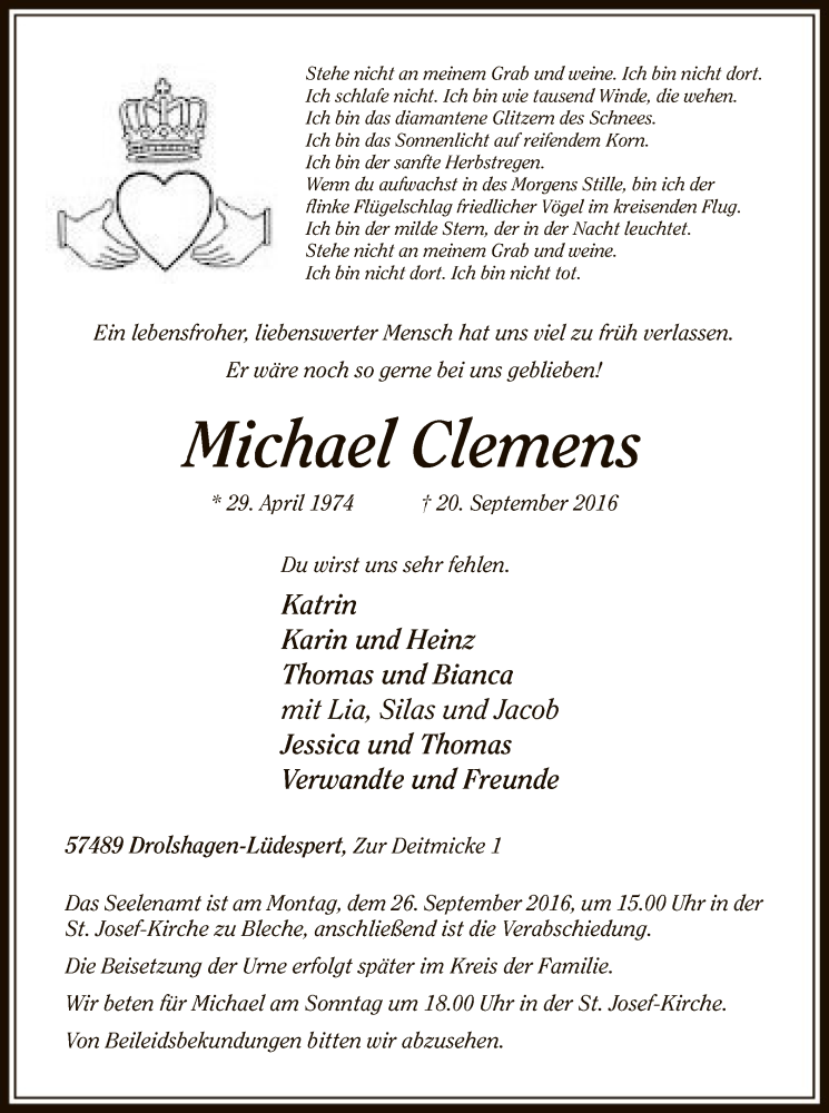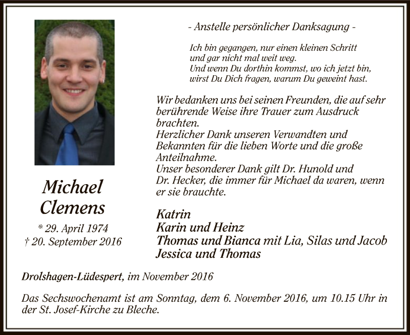 Hier finden Sie alle Traueranzeigen aus der Zeitung, die bisher für Michael Clemens erschienen sind. Weitere Traueranzeigen, die in der Zeitung erscheinen, werden hier ebenfalls aufgelistet