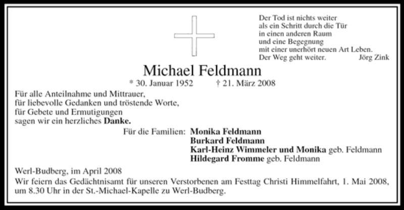 Hier finden Sie alle Traueranzeigen aus der Zeitung, die bisher für Michael Feldmann erschienen sind. Weitere Traueranzeigen, die in der Zeitung erscheinen, werden hier ebenfalls aufgelistet