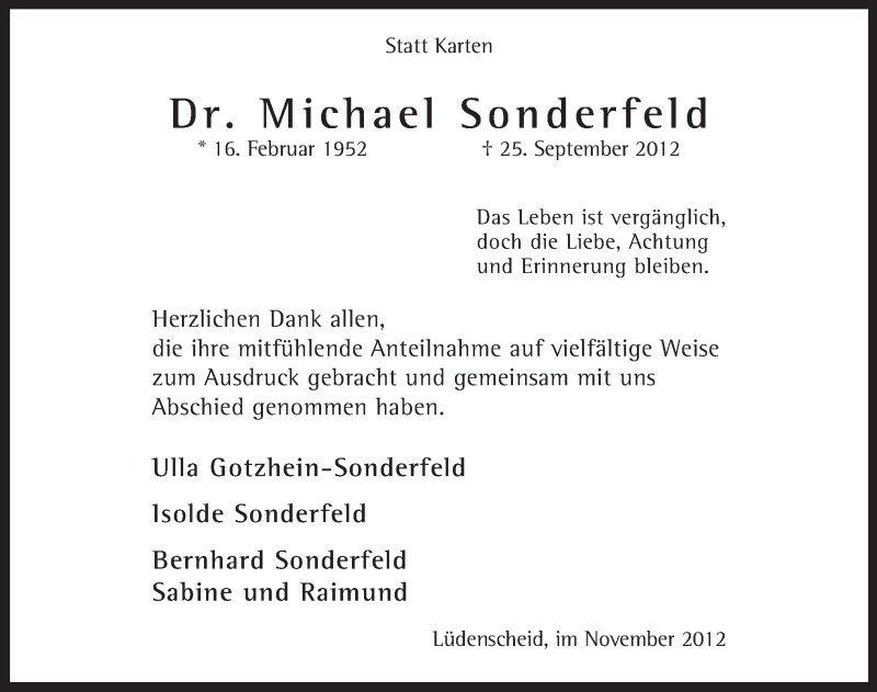 Hier finden Sie alle Traueranzeigen aus der Zeitung, die bisher für Michael Sonderfeld erschienen sind. Weitere Traueranzeigen, die in der Zeitung erscheinen, werden hier ebenfalls aufgelistet