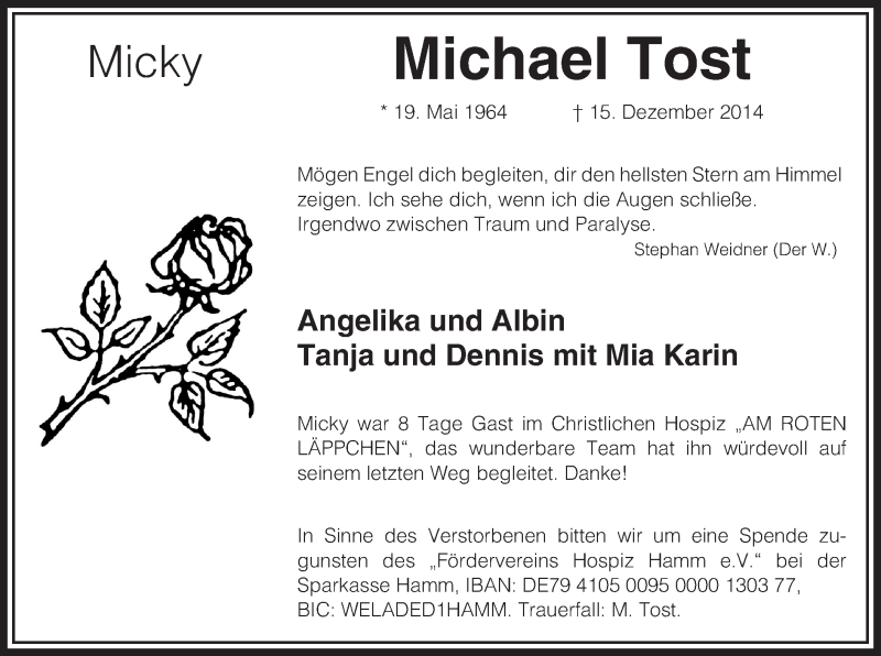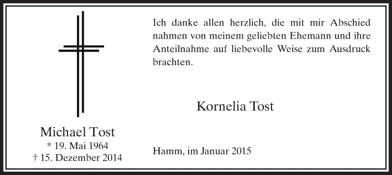 Hier finden Sie alle Traueranzeigen aus der Zeitung, die bisher für Michael Tost erschienen sind. Weitere Traueranzeigen, die in der Zeitung erscheinen, werden hier ebenfalls aufgelistet
