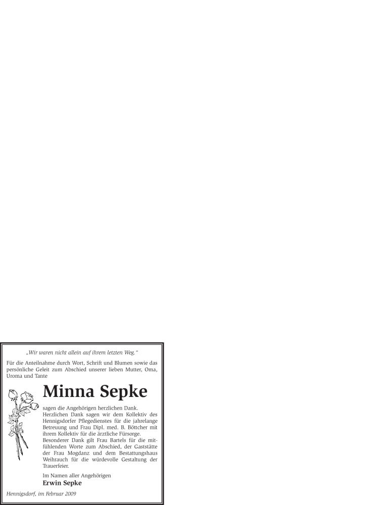 Hier finden Sie alle Traueranzeigen aus der Zeitung, die bisher für Minna Sepke erschienen sind. Weitere Traueranzeigen, die in der Zeitung erscheinen, werden hier ebenfalls aufgelistet