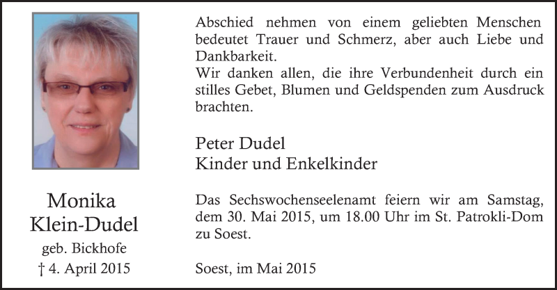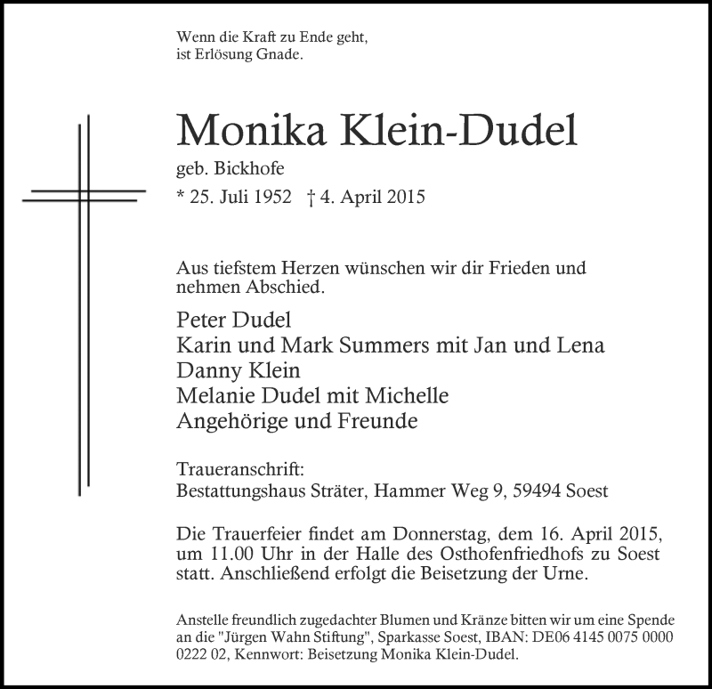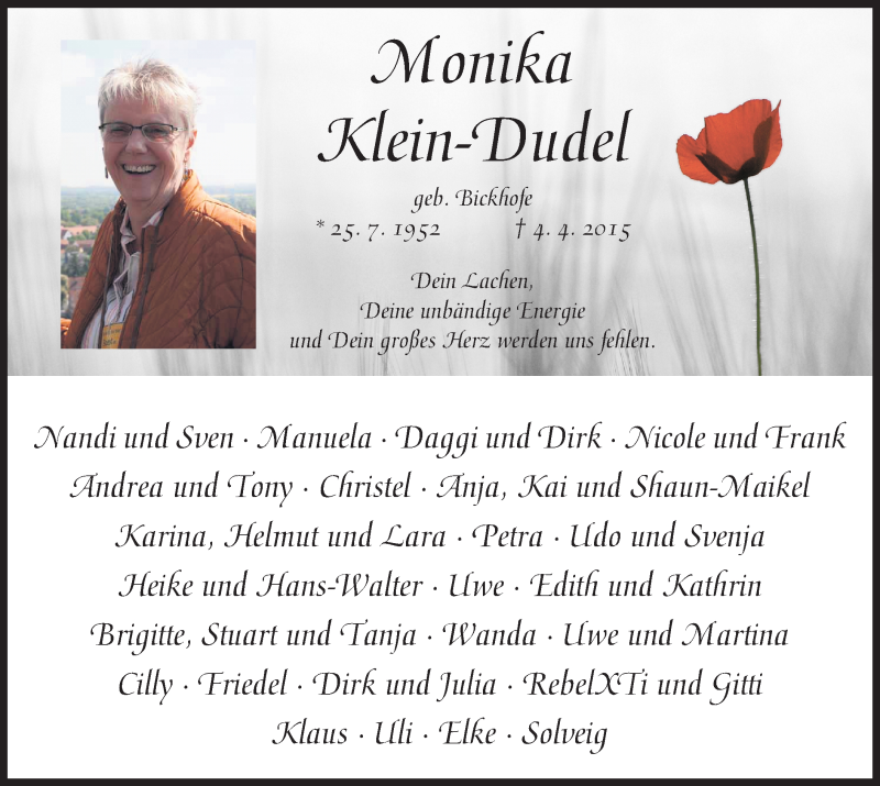 Hier finden Sie alle Traueranzeigen aus der Zeitung, die bisher für Monika Klein-Dudel erschienen sind. Weitere Traueranzeigen, die in der Zeitung erscheinen, werden hier ebenfalls aufgelistet