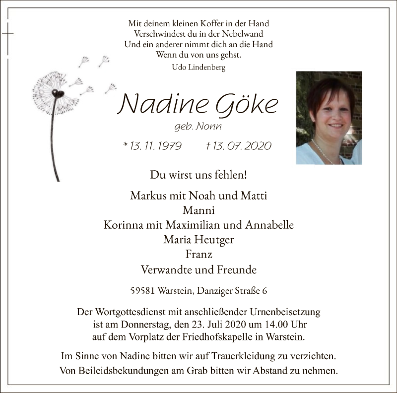 Hier finden Sie alle Traueranzeigen aus der Zeitung, die bisher für Nadine Göke erschienen sind. Weitere Traueranzeigen, die in der Zeitung erscheinen, werden hier ebenfalls aufgelistet
