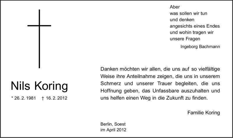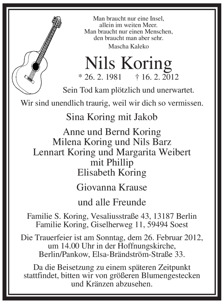 Hier finden Sie alle Traueranzeigen aus der Zeitung, die bisher für Nils Koring erschienen sind. Weitere Traueranzeigen, die in der Zeitung erscheinen, werden hier ebenfalls aufgelistet
