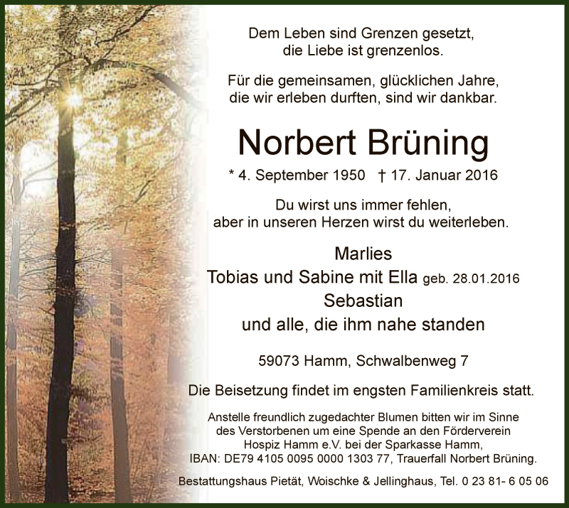 Hier finden Sie alle Traueranzeigen aus der Zeitung, die bisher für Norbert Brüning erschienen sind. Weitere Traueranzeigen, die in der Zeitung erscheinen, werden hier ebenfalls aufgelistet