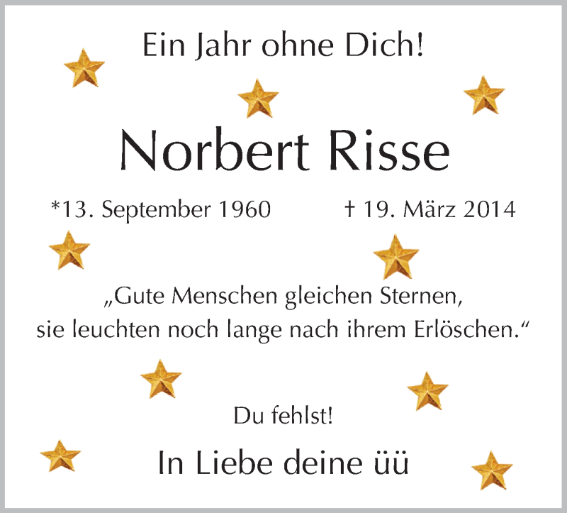 Hier finden Sie alle Traueranzeigen aus der Zeitung, die bisher für Norbert Risse erschienen sind. Weitere Traueranzeigen, die in der Zeitung erscheinen, werden hier ebenfalls aufgelistet