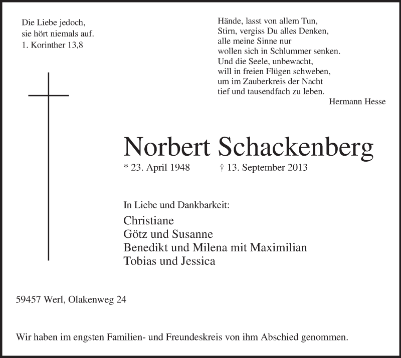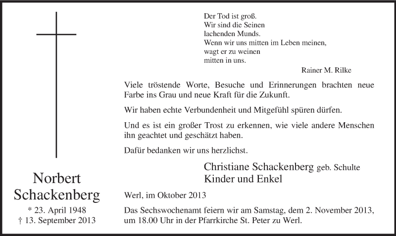 Hier finden Sie alle Traueranzeigen aus der Zeitung, die bisher für Norbert Schackenberg erschienen sind. Weitere Traueranzeigen, die in der Zeitung erscheinen, werden hier ebenfalls aufgelistet