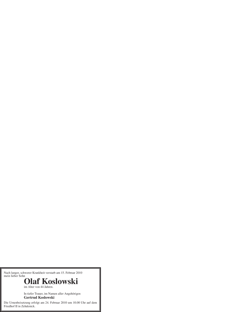 Hier finden Sie alle Traueranzeigen aus der Zeitung, die bisher für Olaf Koslowski erschienen sind. Weitere Traueranzeigen, die in der Zeitung erscheinen, werden hier ebenfalls aufgelistet