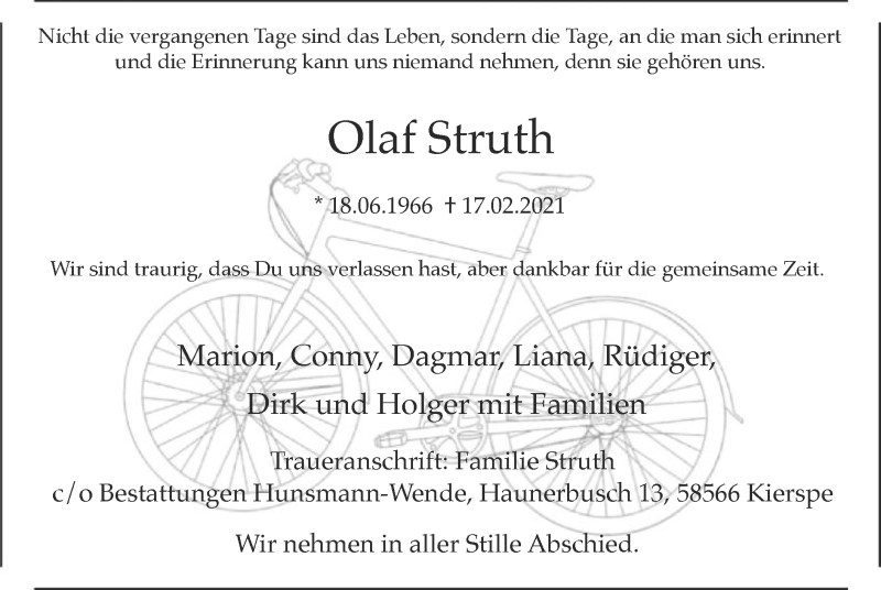 Hier finden Sie alle Traueranzeigen aus der Zeitung, die bisher für Olaf Struth erschienen sind. Weitere Traueranzeigen, die in der Zeitung erscheinen, werden hier ebenfalls aufgelistet