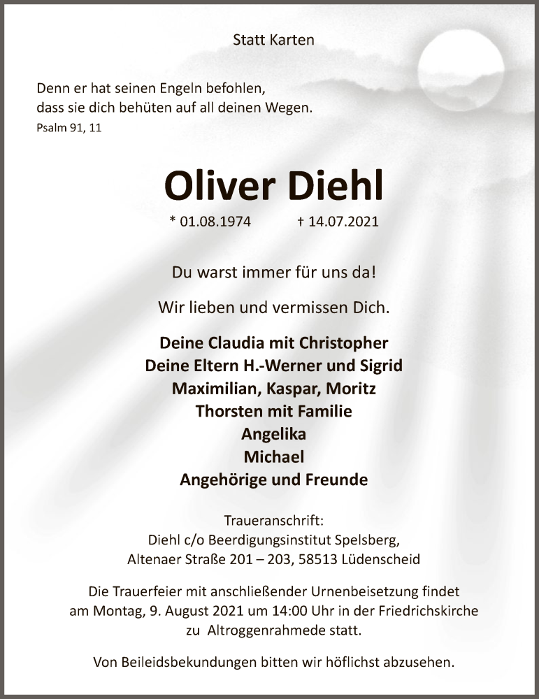 Hier finden Sie alle Traueranzeigen aus der Zeitung, die bisher für Oliver Diehl erschienen sind. Weitere Traueranzeigen, die in der Zeitung erscheinen, werden hier ebenfalls aufgelistet