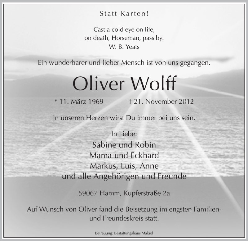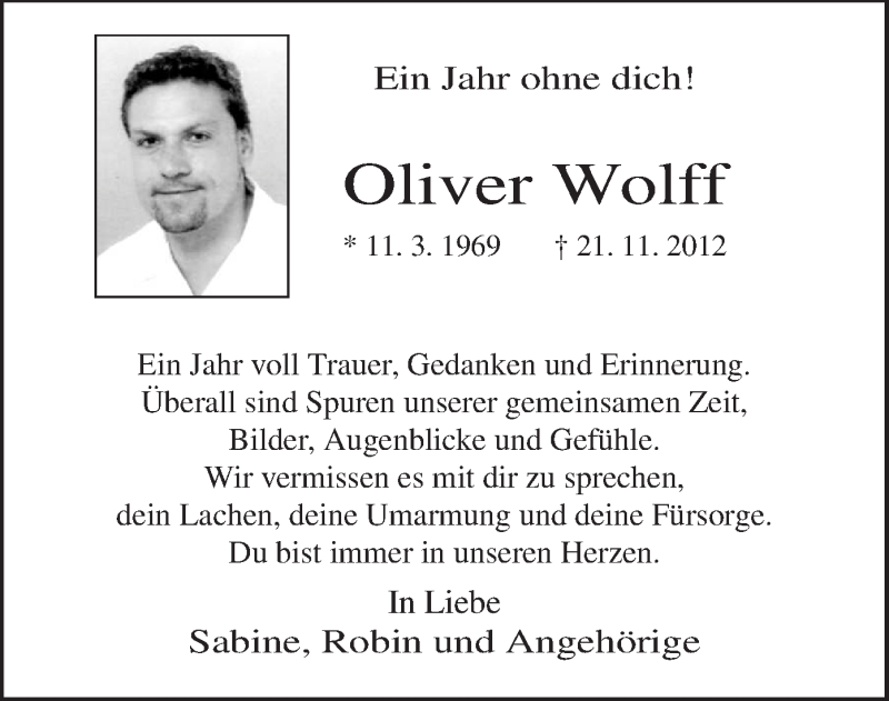 Hier finden Sie alle Traueranzeigen aus der Zeitung, die bisher für Oliver Wolff erschienen sind. Weitere Traueranzeigen, die in der Zeitung erscheinen, werden hier ebenfalls aufgelistet