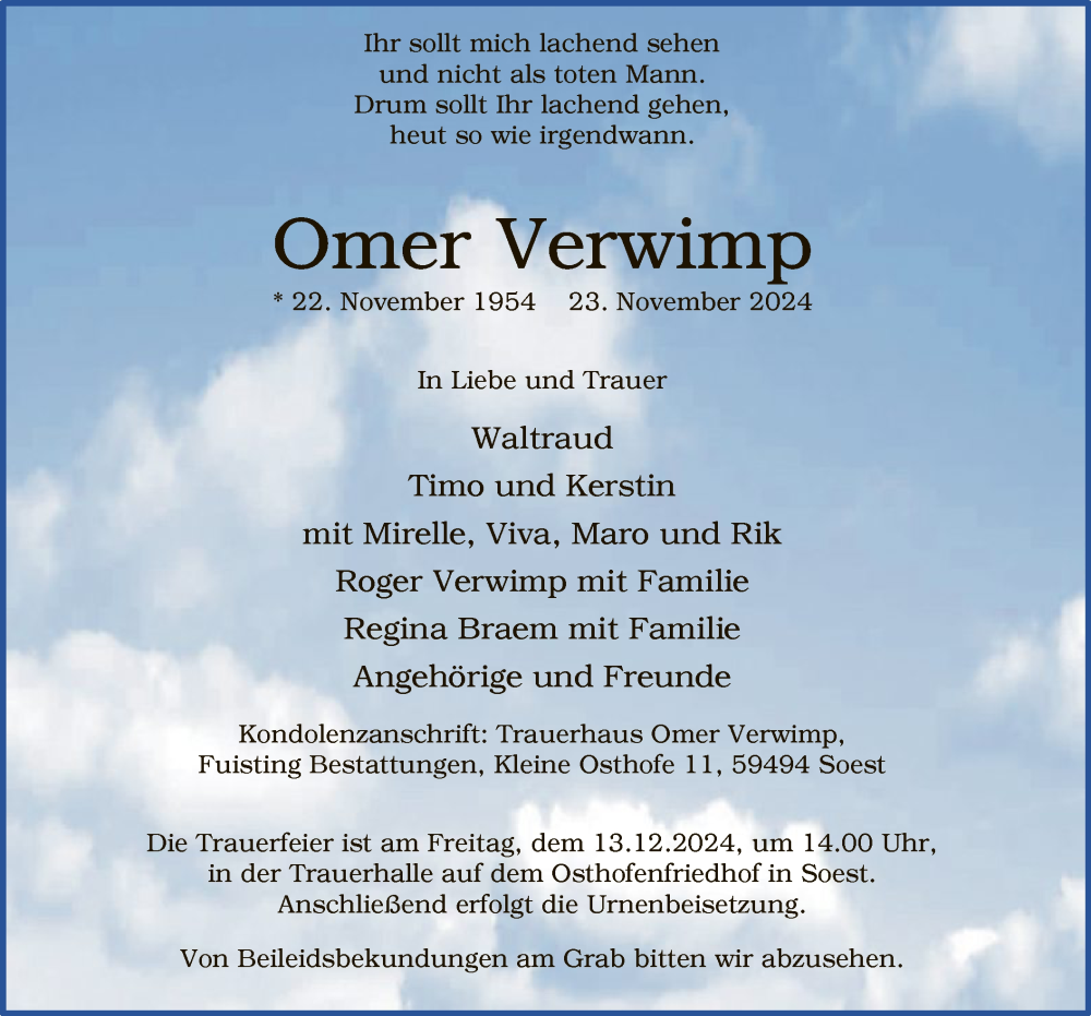 Hier finden Sie alle Traueranzeigen aus der Zeitung, die bisher für Omer Verwimp erschienen sind. Weitere Traueranzeigen, die in der Zeitung erscheinen, werden hier ebenfalls aufgelistet