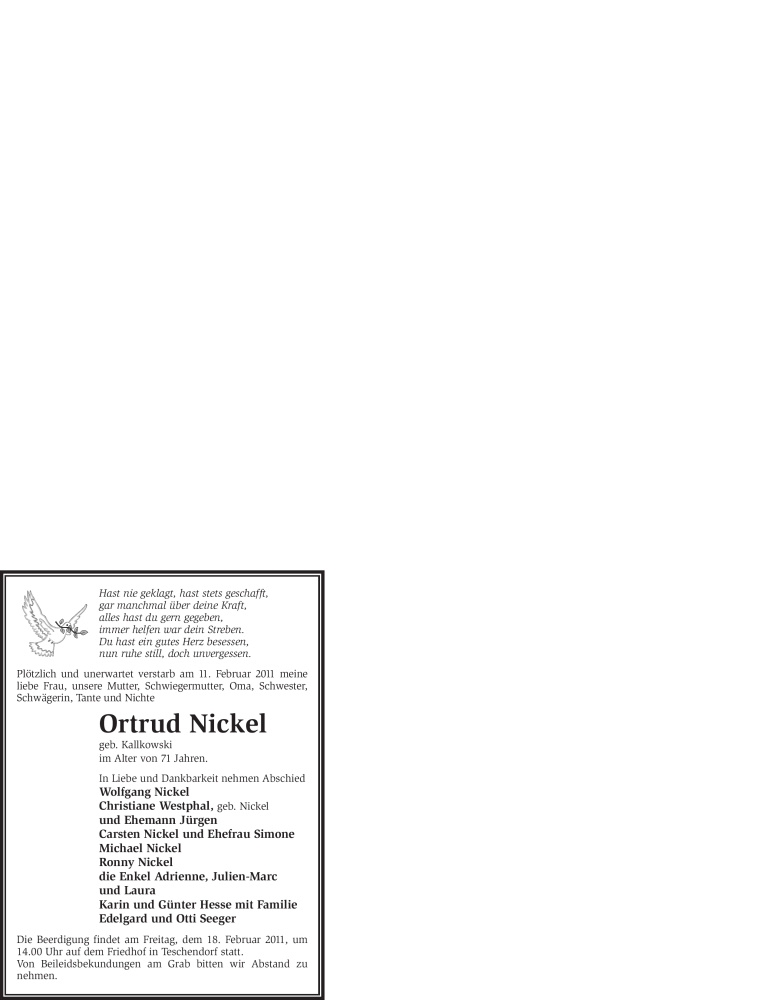 Hier finden Sie alle Traueranzeigen aus der Zeitung, die bisher für Ortrud Nickel erschienen sind. Weitere Traueranzeigen, die in der Zeitung erscheinen, werden hier ebenfalls aufgelistet