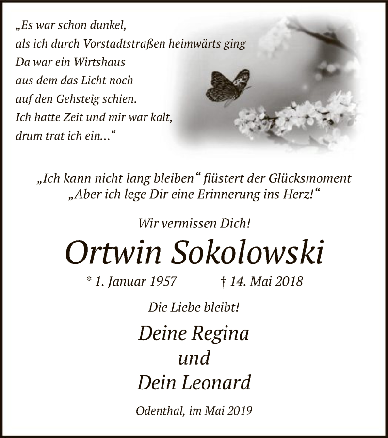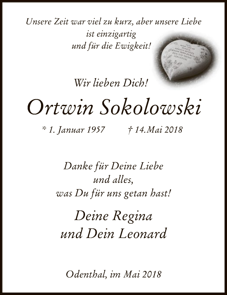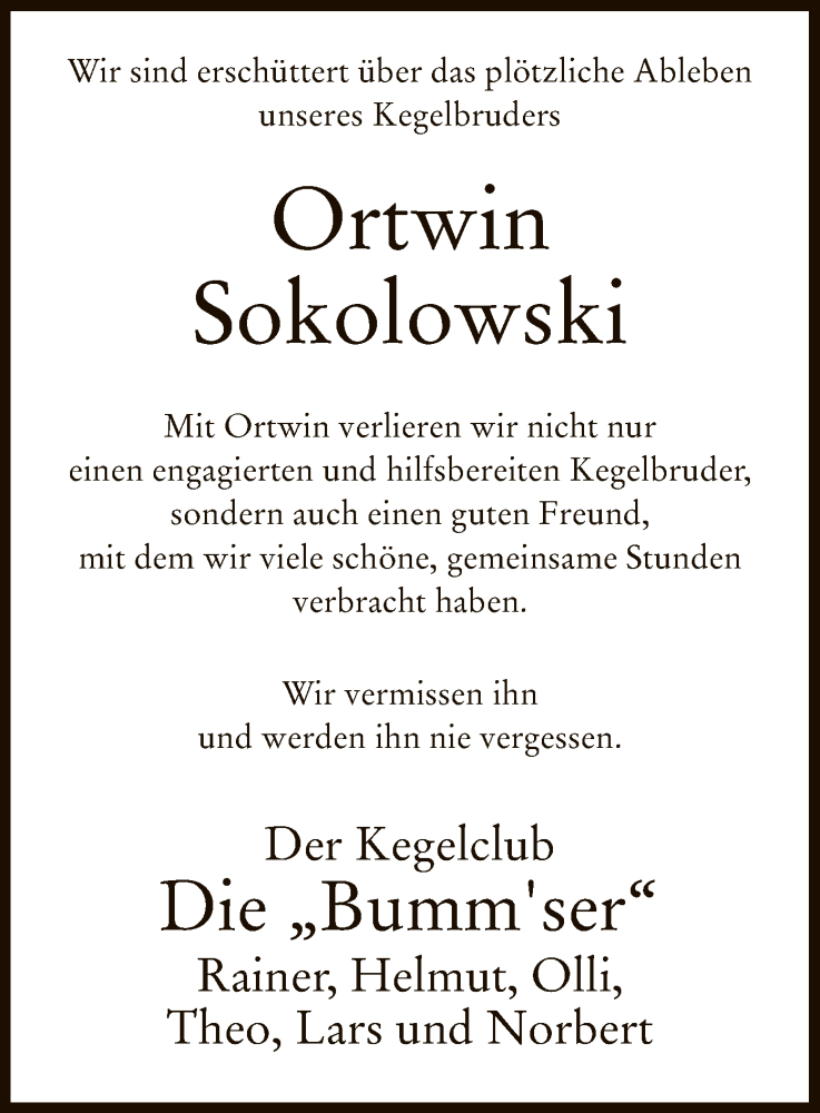 Hier finden Sie alle Traueranzeigen aus der Zeitung, die bisher für Ortwin Sokolowski erschienen sind. Weitere Traueranzeigen, die in der Zeitung erscheinen, werden hier ebenfalls aufgelistet