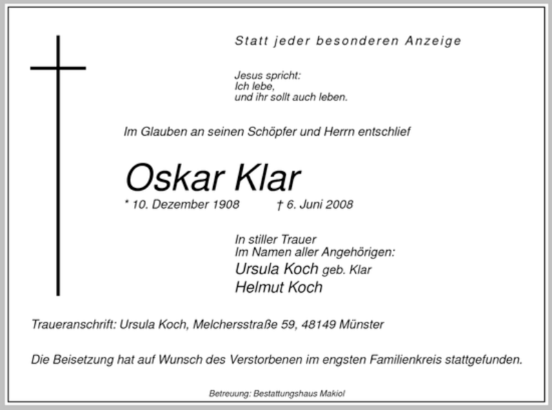 Hier finden Sie alle Traueranzeigen aus der Zeitung, die bisher für Oskar Klar erschienen sind. Weitere Traueranzeigen, die in der Zeitung erscheinen, werden hier ebenfalls aufgelistet