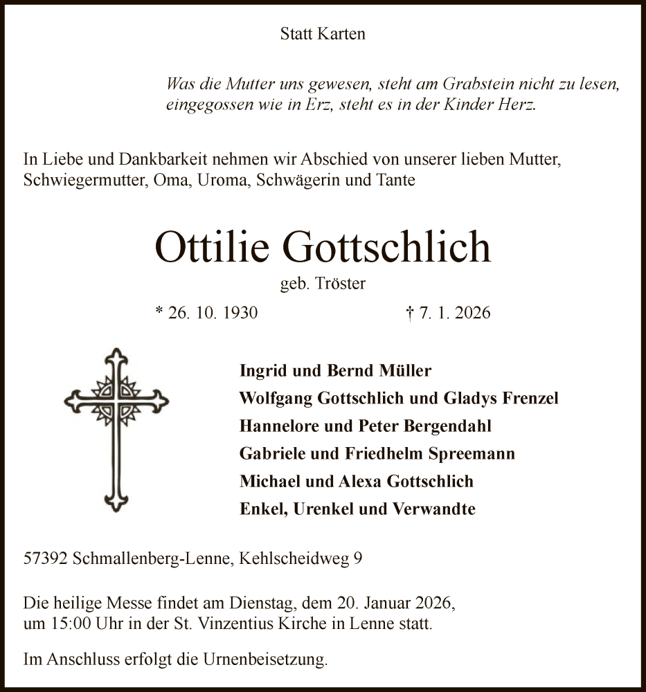 Hier finden Sie alle Traueranzeigen aus der Zeitung, die bisher für Ottilie Gottschlich erschienen sind. Weitere Traueranzeigen, die in der Zeitung erscheinen, werden hier ebenfalls aufgelistet