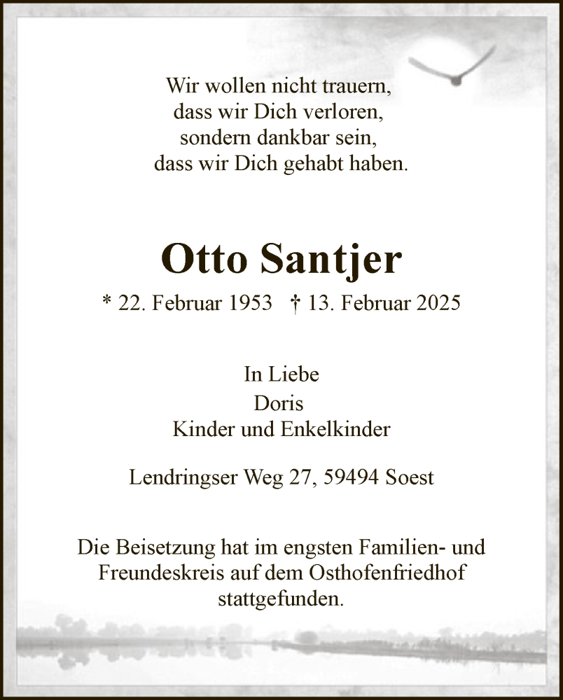 Hier finden Sie alle Traueranzeigen aus der Zeitung, die bisher für Otto Santjer erschienen sind. Weitere Traueranzeigen, die in der Zeitung erscheinen, werden hier ebenfalls aufgelistet