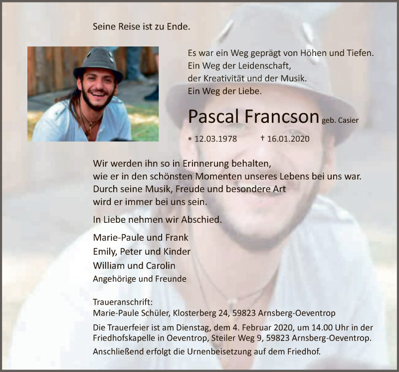 Hier finden Sie alle Traueranzeigen aus der Zeitung, die bisher für Pascal Francson erschienen sind. Weitere Traueranzeigen, die in der Zeitung erscheinen, werden hier ebenfalls aufgelistet