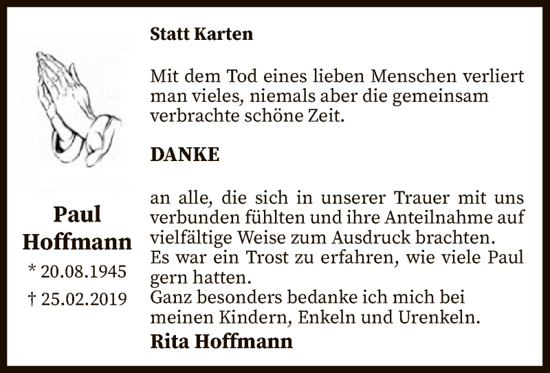 Hier finden Sie alle Traueranzeigen aus der Zeitung, die bisher für Paul Hoffmann erschienen sind. Weitere Traueranzeigen, die in der Zeitung erscheinen, werden hier ebenfalls aufgelistet