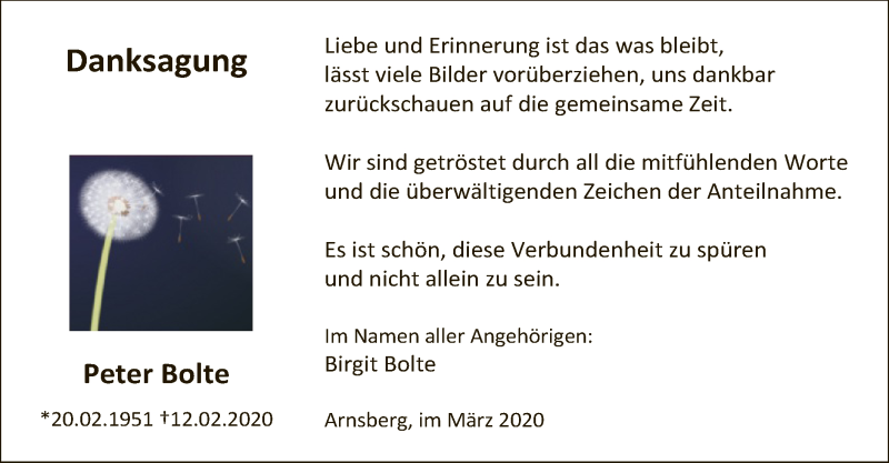 Hier finden Sie alle Traueranzeigen aus der Zeitung, die bisher für Peter Bolte erschienen sind. Weitere Traueranzeigen, die in der Zeitung erscheinen, werden hier ebenfalls aufgelistet