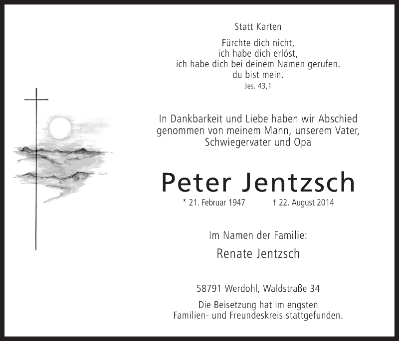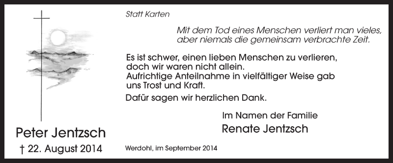 Hier finden Sie alle Traueranzeigen aus der Zeitung, die bisher für Peter Jentzsch erschienen sind. Weitere Traueranzeigen, die in der Zeitung erscheinen, werden hier ebenfalls aufgelistet