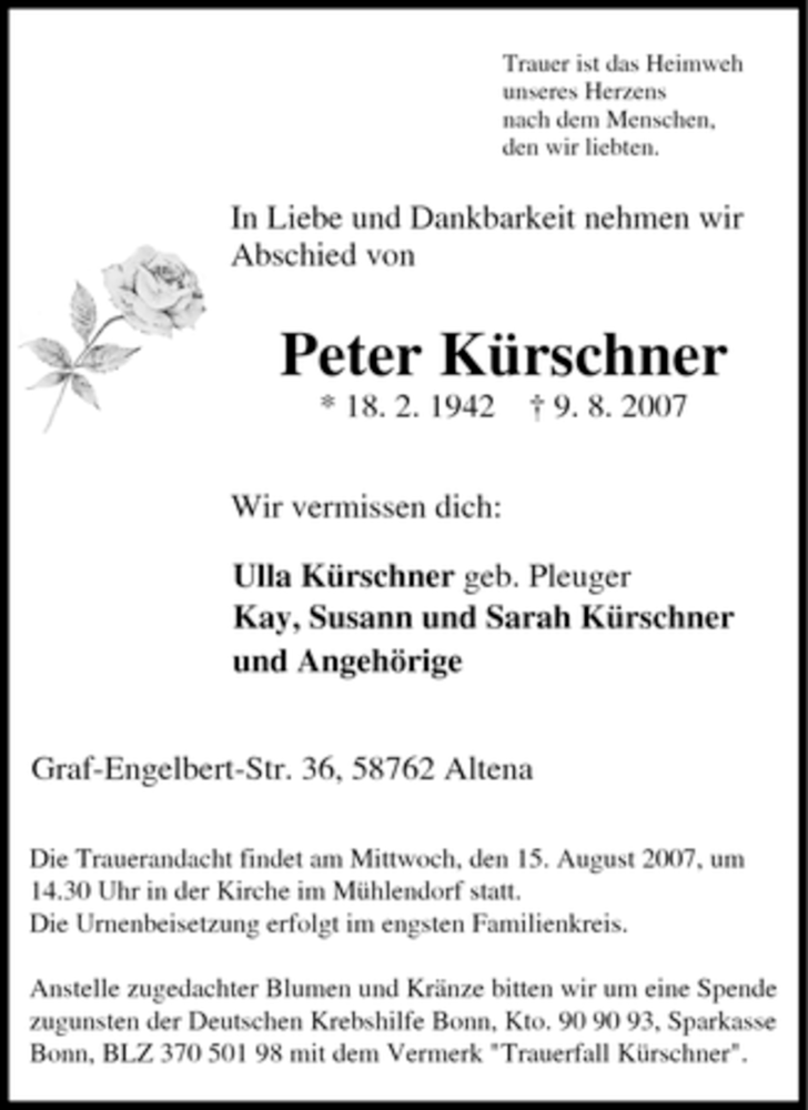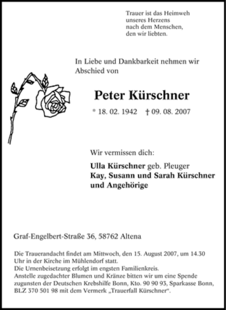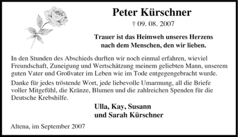 Hier finden Sie alle Traueranzeigen aus der Zeitung, die bisher für Peter Kürschner erschienen sind. Weitere Traueranzeigen, die in der Zeitung erscheinen, werden hier ebenfalls aufgelistet