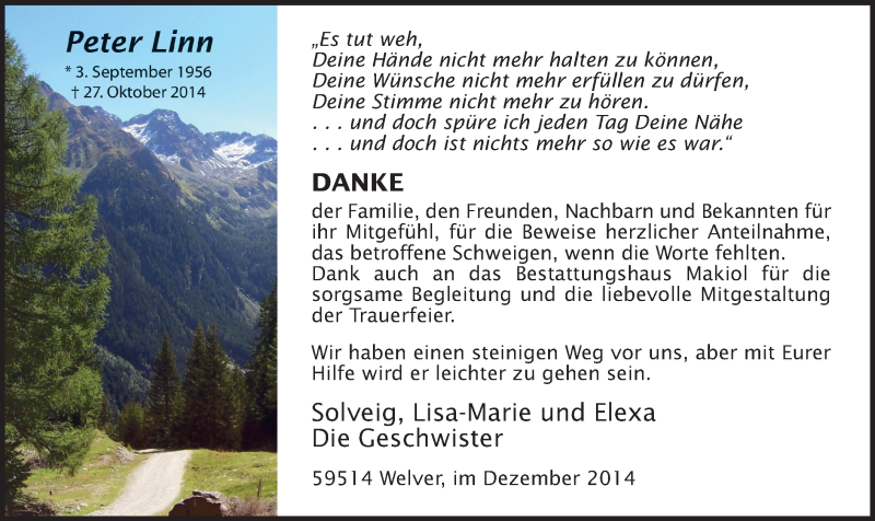 Hier finden Sie alle Traueranzeigen aus der Zeitung, die bisher für Peter Linn erschienen sind. Weitere Traueranzeigen, die in der Zeitung erscheinen, werden hier ebenfalls aufgelistet