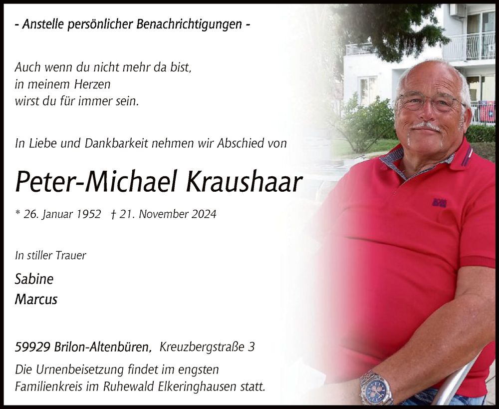 Hier finden Sie alle Traueranzeigen aus der Zeitung, die bisher für Peter-Michael Kraushaar erschienen sind. Weitere Traueranzeigen, die in der Zeitung erscheinen, werden hier ebenfalls aufgelistet