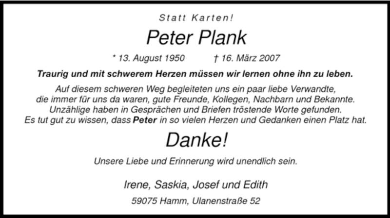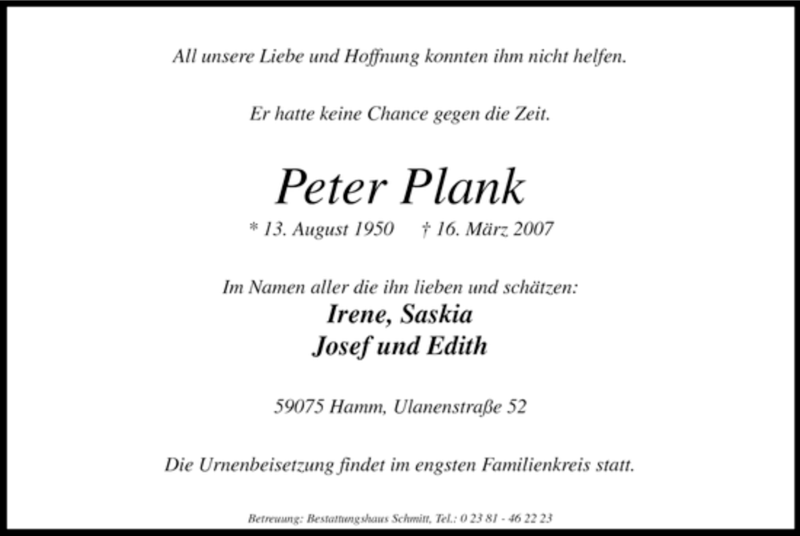 Hier finden Sie alle Traueranzeigen aus der Zeitung, die bisher für Peter Plank erschienen sind. Weitere Traueranzeigen, die in der Zeitung erscheinen, werden hier ebenfalls aufgelistet