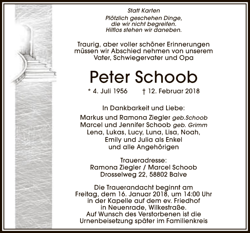 Hier finden Sie alle Traueranzeigen aus der Zeitung, die bisher für Peter Schoob erschienen sind. Weitere Traueranzeigen, die in der Zeitung erscheinen, werden hier ebenfalls aufgelistet