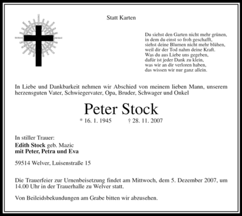 Hier finden Sie alle Traueranzeigen aus der Zeitung, die bisher für Peter Stock erschienen sind. Weitere Traueranzeigen, die in der Zeitung erscheinen, werden hier ebenfalls aufgelistet