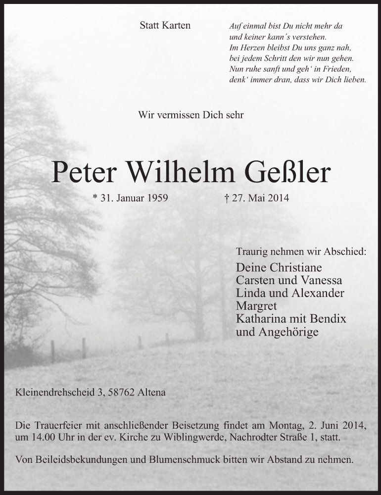 Hier finden Sie alle Traueranzeigen aus der Zeitung, die bisher für Peter Wilhelm Geßler erschienen sind. Weitere Traueranzeigen, die in der Zeitung erscheinen, werden hier ebenfalls aufgelistet