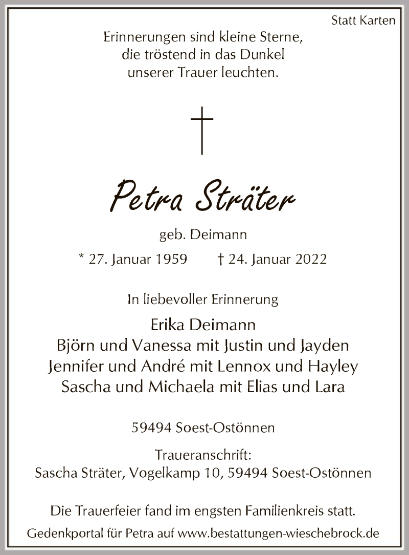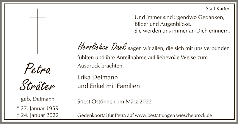 Hier finden Sie alle Traueranzeigen aus der Zeitung, die bisher für Petra Sträter erschienen sind. Weitere Traueranzeigen, die in der Zeitung erscheinen, werden hier ebenfalls aufgelistet