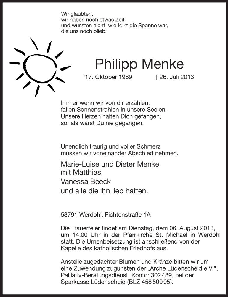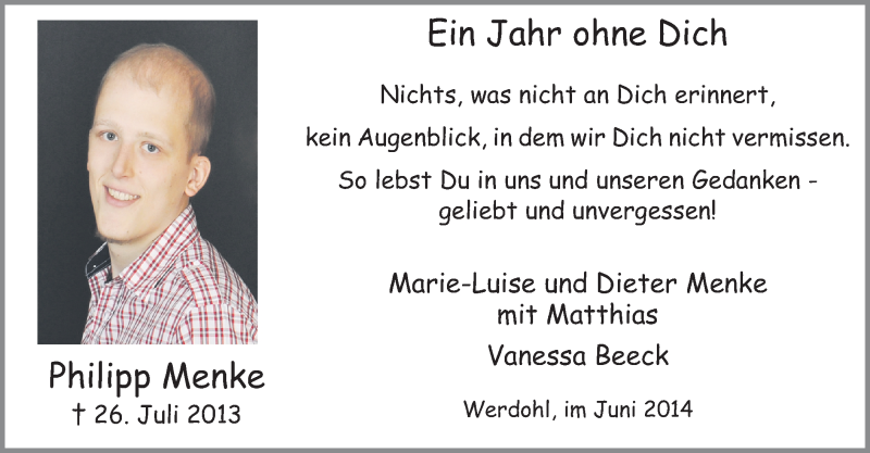 Hier finden Sie alle Traueranzeigen aus der Zeitung, die bisher für Philipp Menke erschienen sind. Weitere Traueranzeigen, die in der Zeitung erscheinen, werden hier ebenfalls aufgelistet