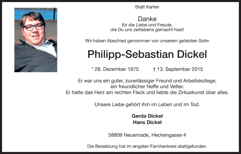 Hier finden Sie alle Traueranzeigen aus der Zeitung, die bisher für Philipp-Sebastian Dickel erschienen sind. Weitere Traueranzeigen, die in der Zeitung erscheinen, werden hier ebenfalls aufgelistet
