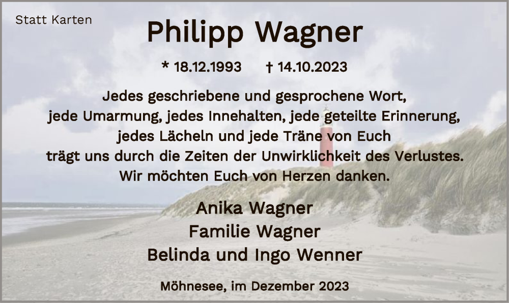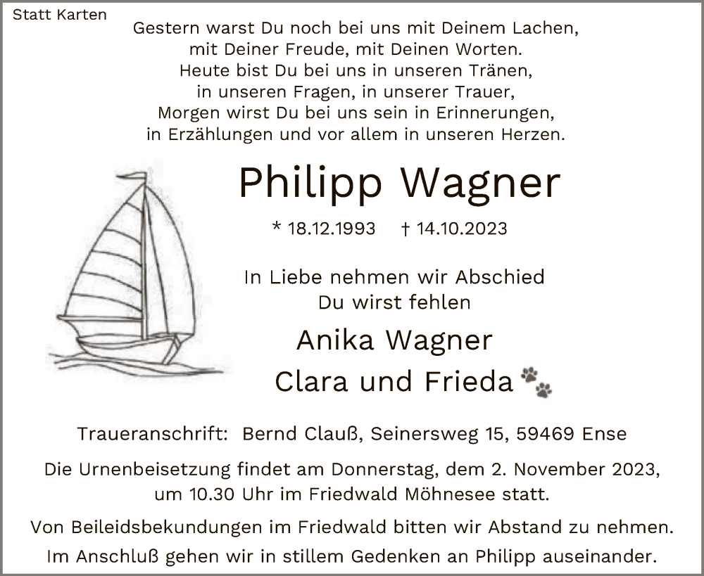 Hier finden Sie alle Traueranzeigen aus der Zeitung, die bisher für Philipp Wagner erschienen sind. Weitere Traueranzeigen, die in der Zeitung erscheinen, werden hier ebenfalls aufgelistet
