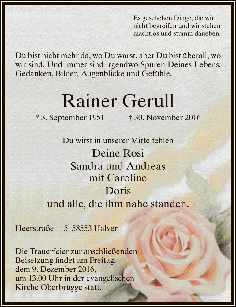 Hier finden Sie alle Traueranzeigen aus der Zeitung, die bisher für Rainer Gerull erschienen sind. Weitere Traueranzeigen, die in der Zeitung erscheinen, werden hier ebenfalls aufgelistet