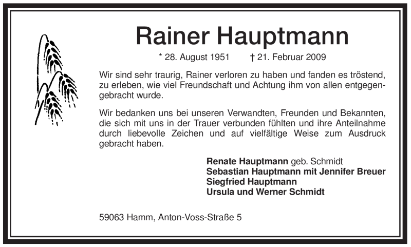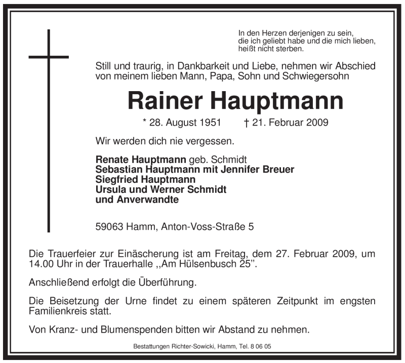 Hier finden Sie alle Traueranzeigen aus der Zeitung, die bisher für Rainer Hauptmann erschienen sind. Weitere Traueranzeigen, die in der Zeitung erscheinen, werden hier ebenfalls aufgelistet